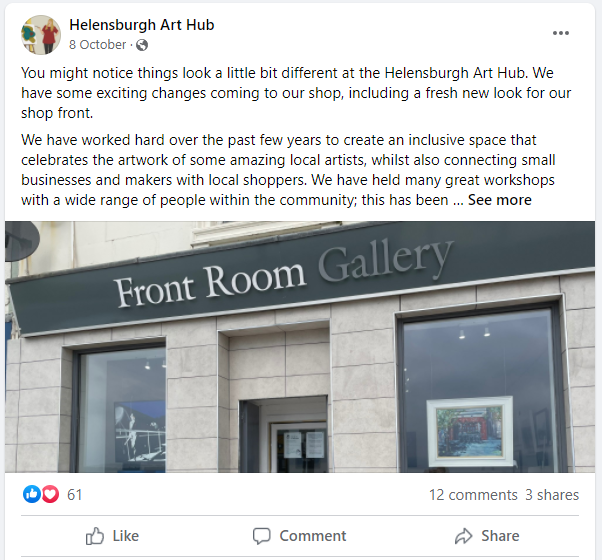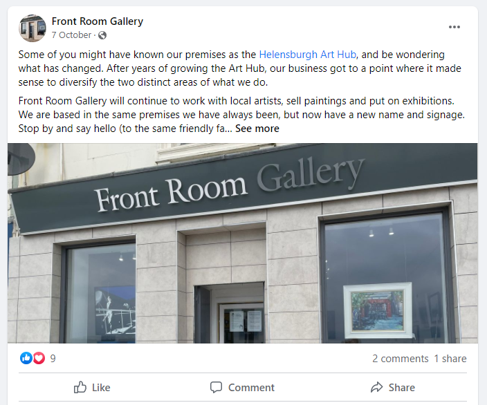 I had previously worked with art gallery and art supply shop, Helensburgh Art Hub to create and schedule social media posts. So, when they decided to expand their business to include a new brand called Front Room Gallery, they reached out to me to write a statement that could be shared on their social media and in their local newspaper to explain the change.